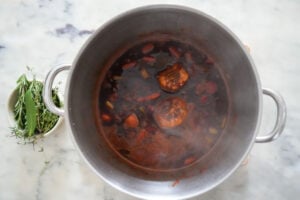 - Carefully pour the vegetables and wine mixture into the slow cooker. Then, add the beef broth and herbs.