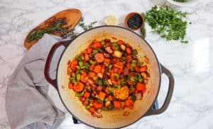 - Step 4: Saute And Season The Vegetables Pour off all but 2 tablespoons of remaining oil in the pan. Reduce heat to medium, and add garlic, cut side down and cook, undisturbed, until golden brown, about 1 to 2 minutes. Add onion, celery, carrots, and jalapeño and season with salt, pepper, and smoked paprika. Mix well and continue to cook until vegetables are softened but not yet browned, about 5 to 10 minutes.