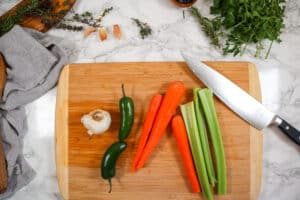 - Step 2: Prepare The VegetablesThe vegetables, herbs, and aromatics needed for this dish are garlic, celery, carrots, onion, jalapeno, rosemary, thyme, and parsley. To prepare the vegetables simply give them a rough chop. They are needed simply to flavor the sauce. Once the short ribs are fully cooked you can strain the sauce, removing the vegetables as they will have rendered all their flavor and are no longer edible.